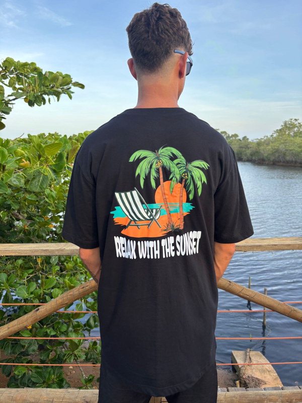 A camiseta stretwear Relax The Sunset é produzida com modelagem exclusiva oversized e acabamento de extrema qualidade. Fabricada em 100% algodão com fio 30.1 penteado e gramatura de180 g/m². O tecido passa por um processo especial de pré encolhimento garantindo que sua peça não encolha drasticamente como uma camiseta comum e tenha duração maior do que as demais. Utilizamos a melhor tecnologia para aplicação das estampas em DTF (Direct to film).